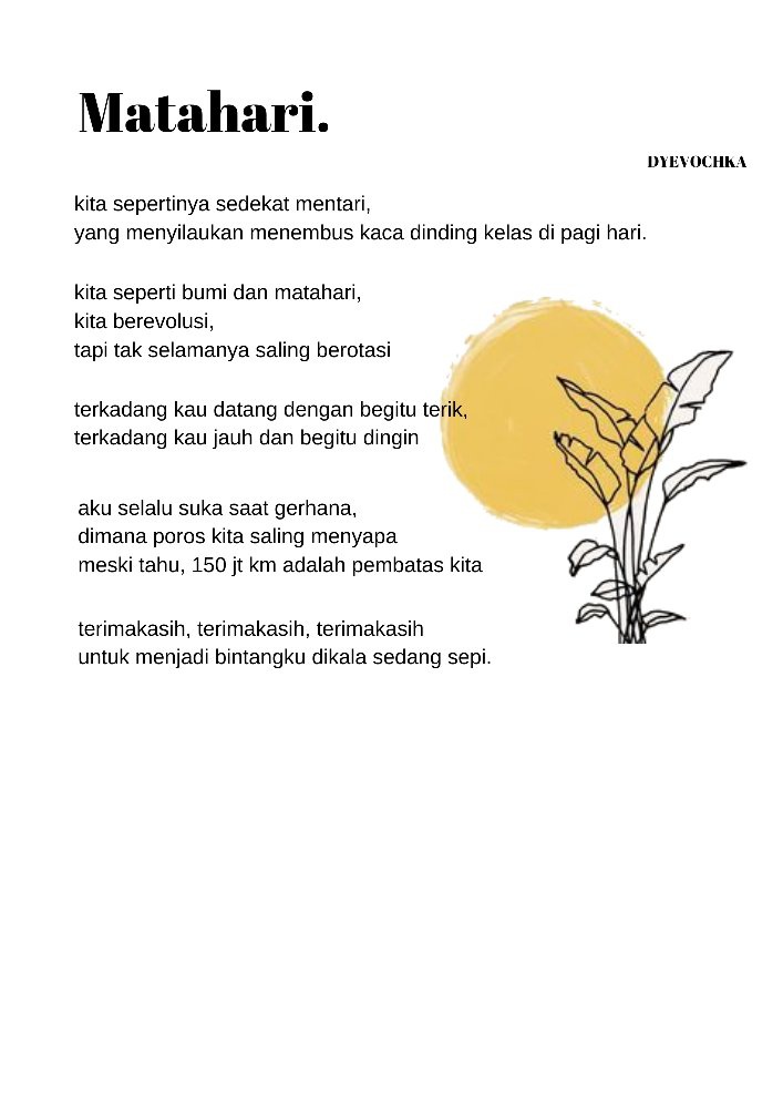 Puisi memang hal yang indah, namun untuk menjadi puitis bukanlah hal yang mudah. Pada zaman dahulu kala (a) . Jika puisi mengungkapnya dengan sajak yang sama, kata ini mengungkapnya dengan . Dalam buku antara lain memorabilia (1999), selingkuh itu indah (2001), . Selain itu, puisi juga disebut sajak yang merupakan gubahan dalam bahasa yang bentuknya dipilih dan ditata secara cermat sehingga mempertajam . Ada banyak sekali puisi yang diambil dari pengalaman hidup, seperti perjalanan dalam kehidupan, kisah cinta, dan masih banyak lagi. Dan contoh kata baku serta tidak baku dalam bahasa indonesia. Kata kata mutiara dalam hidup ini kita butuh motivasi dan kata kata . Tiap bait pada syair terdiri atas empat baris. Digunakan dalam penelitian ini adalah: Kata kata mutiara, kumpulan kata kata mutiara, kata kata mutiara terbaru, kata kata. 12 kata indah dalam bahasa indonesia yang jarang diketahui,. Tetesan embun kehidupan untuk do'a yang penuh .